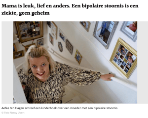 Aefke schrijft ook boeken. ’Mijn moeder kookt soep van tafelpoten’ verschijnt in november bij de Alkmaarse uitgeverij Kluitman. In dit jeugdboek lees je dat Fiep het er best moeilijk mee heeft dat haar moeder een bipolaire stoornis heeft, maar moeilijk mee. Terwijl er in haar eigen leven allerlei spannende dingen gebeuren maakt ze zich zorgen over wat er thuis aan de hand is. De ene dag brengt moeder haar in een elfenjurk naar school en op andere momenten is mama juist erg verdrietig. Dit maakt het leven voor Fiep behoorlijk ingewikkeld. ,,Het boek verschijnt op 22 november, dat is de dag van het kopp-kind. Kopp staat voor ‘Kinderen van Ouders met Psychische Problemen’. Door de situatie waarin ze opgroeien, kunnen deze kinderen behoorlijk in de knel komen te zitten. Vandaar ook dit nieuwe boek. Het thema moet bespreek zijn. Ik heb eerder boeken over bipolaire stoornis geschreven. Onder pseudoniem, ik was er nog niet aan toe om echt met mijn verhaal naar buiten te komen. Dat ik me niet langer verstop komt door mijn jongens. Ik wil ze leren dat ze zich best voor me mogen schamen als ik uit de bocht vlieg maar dat mijn ziekte geen geheim hoeft te blijven.’’